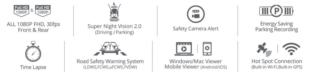 - Resolution: Front: Full HD (1920 x 1080P) Rear: Full HD (1920 x 1080P)