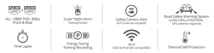 - Recording Modes: Continuous Recording, Incident Recording, Manual Recording, Parking Recording(Motion detection, Time lapse, Energy saving)